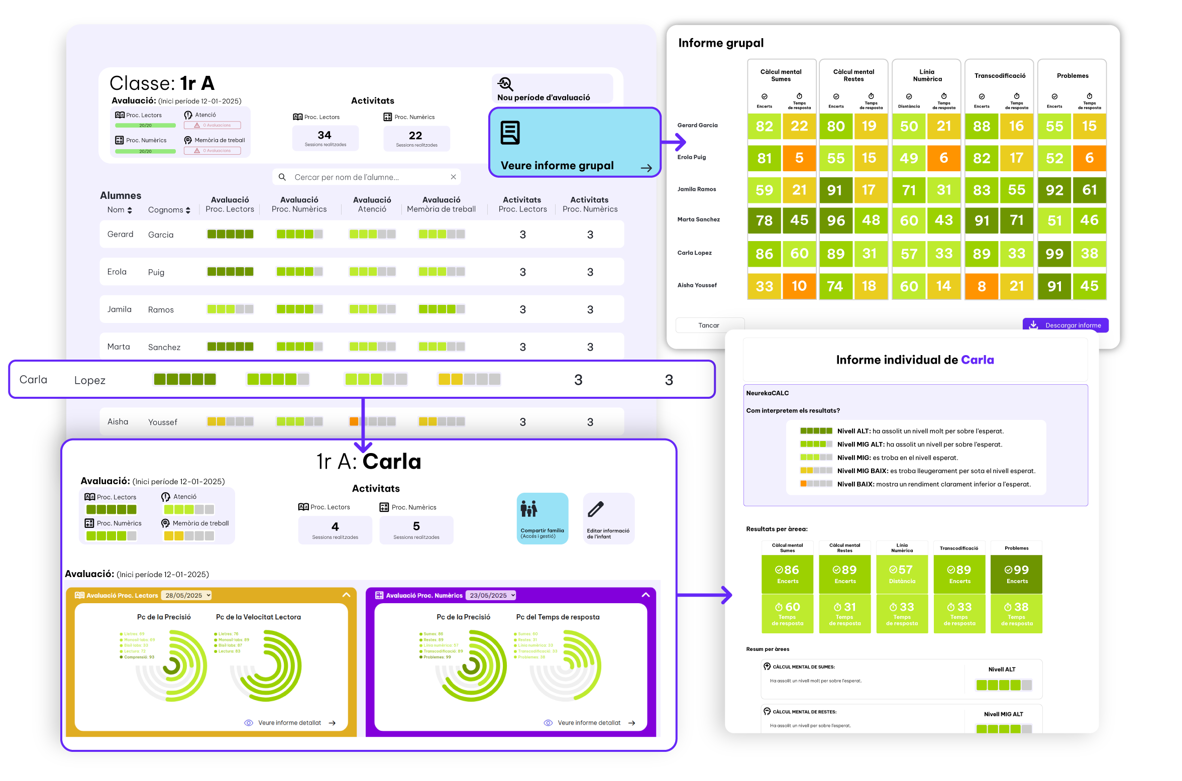 Amb NLAB School, els docents poden fer un seguiment visual i centralitzat del rendiment dels alumnes en lectura, atenció, memòria de treball i processos numèrics. Des del panell de classe és possible veure els resultats de tot el grup, consultar informes individuals automàtics i analitzar l’evolució de cada alumne amb gràfics clars.